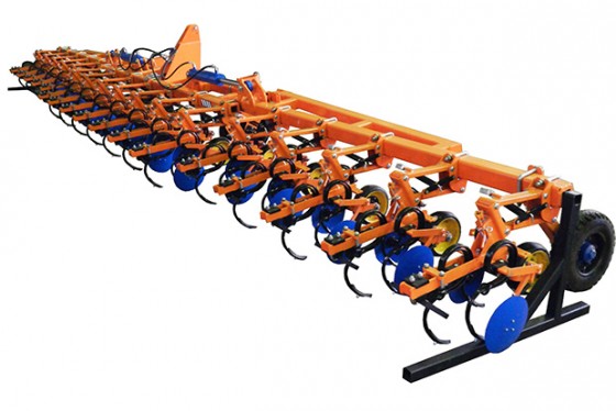 Параллелограммное устройство культиватора обеспечивает точное копирование рельефа почвы с уклонами более 5º, а наличие винтовой пары с упорной резьбой на стойке опорного колеса с мерной шкалой на каждой секции дает возможность точной регулировки глубины обработки.