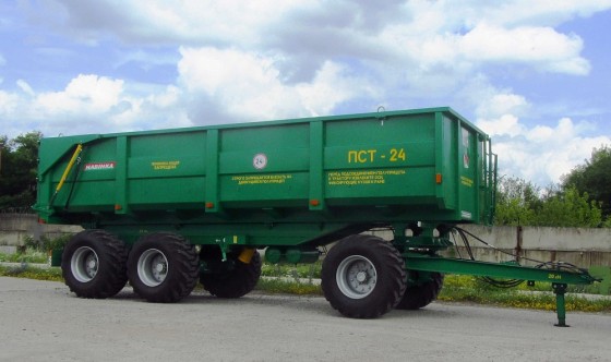 Полуприцеп тракторный нового поколения ПСТ-24 - это унифицированный полуприцеп повышенной грузоподъемности на широкопрофильных шинах к тракторам «БЕЛАРУС» тяговых классов 2-5. Основной цельнометаллический кузов с открывающимся при помощи гидроцилиндров задним бортом, имеет вместимость рассчитанную на перевозку материалов средней плотности (земля, мусор, навоз, силос готовый, удобрения минеральные) с учетом естественного насыпного конуса (шапки). По заказу, для перевозки семян различных культур, корнеклубнеплодов, комбикорма полуприцепы комплектуются низкими надставными бортами, а для легковесных грузов-высокими надставными бортами.