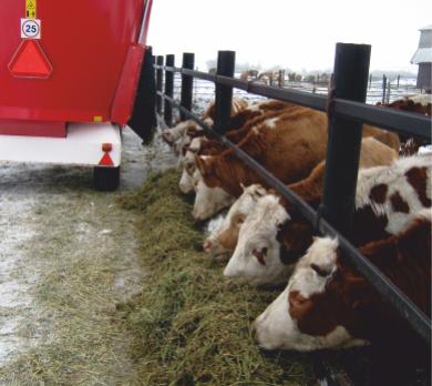 Раздача готовой полнорационной смеси производится через боковые клапаны налево, направо или одновременно на обе стороны при совпадении ширины кормового прохода с габаритом смесителя. В стандартную поставку включен сменный комплект ножей шнека.