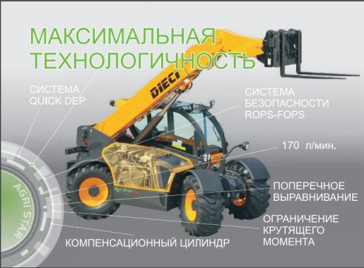 Телескопический погрузчик DIECI AGRI STAR 38.10 оснащен гидростатической трансмиссией, что позволяет работать на медленной скорости и с двигателем на полном газу. Расположение цилиндра внутри стрелы улучшает видимость и безопасность эксплуатации. Погрузчик обладает комфортабельной кабиной, которая по желанию покупателя может быть оснащена улучшенной системой кондиционирования воздуха, а так же сидениями с автоматической подвеской.
