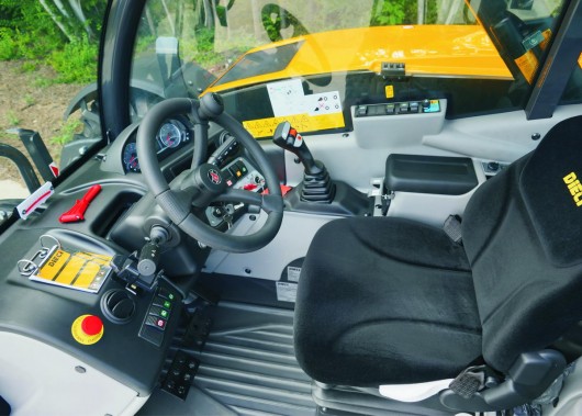 - Закрытая звукоизолированная кабина (соотв. стандартам ROPS-FOPS) с отоплением. Передний и задний стеклоочистители, открывающийся люк, заднее открывающееся окно, разъем для авторадио, регулируемый руль.