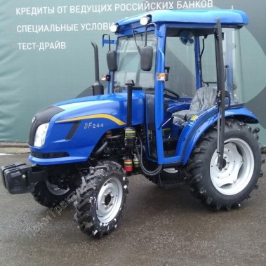 В базовой комплектации трактор Dongfeng DF-244 NEW с кабиной синего цвета в обновленном дизайне оснащается экономичным, четырехтактным, 3-х цилиндровым дизельным 24-ти сильным двигателем (КМ 385BT) водяного охлаждения, полноприводной (4х4) механической трансмиссией (с пониженным рядом и блокировкой заднего дифференциала), счетчиком моточасов. За функционирование гидравлической системы трактора Донг Фенг ДФ-244 отвечает гидронасос, критическим давлением 14 МПа. Дополнительно в базовую комплектацию входит: кабина улучшенного кругового обзора с отопителем, задний вал отбора мощности (ВОМ), задняя 3-х точечная навеска, задний гидравлический распределитель с джойстиком управления с 2-мя коннекторами (гидровыходами). Дополнительно можно до установить: фронтальные противовесы.